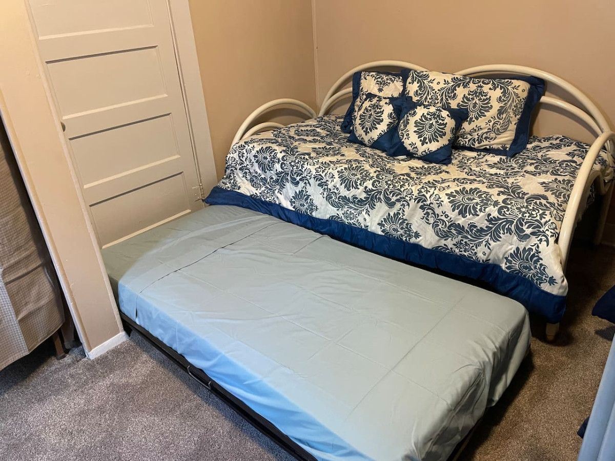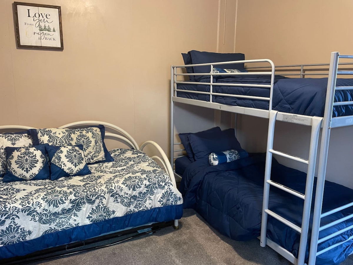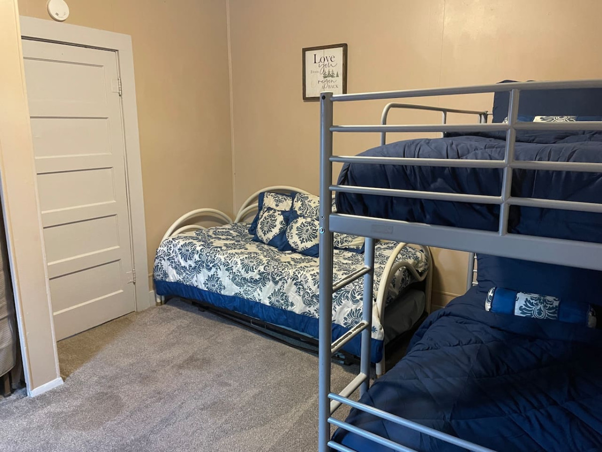 / nightYour family will be close to everything when you stay at this centrally-located home in Burns. This is a 1890’s home that has been providing shelter for many families. Well cared for with a simple comfy feeling. This house has two bedrooms. The primary bedroom has a queen bed to lounge in while watching tv from bed. The second bedroom is the bunk room; There is a twin bunk bed, a twin day bed and a twin trundle all available for use. The house has one shared bathroom for all but the bathroom is well spaced with a full bath and washer and dryer located there also. The kitchen is fully equipped to accommodate family meals. The whole house is open for your stay. Please do not enter the basement or attic spaces though.